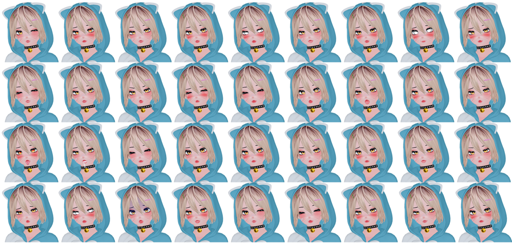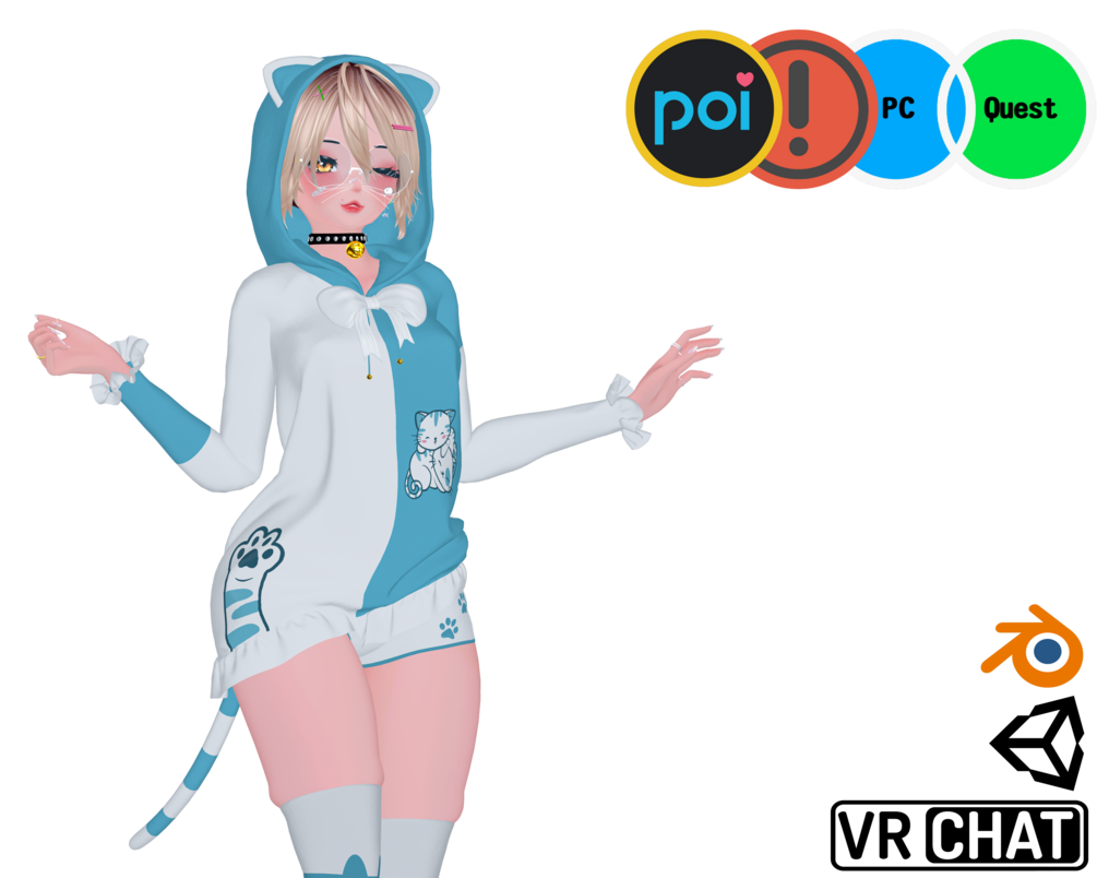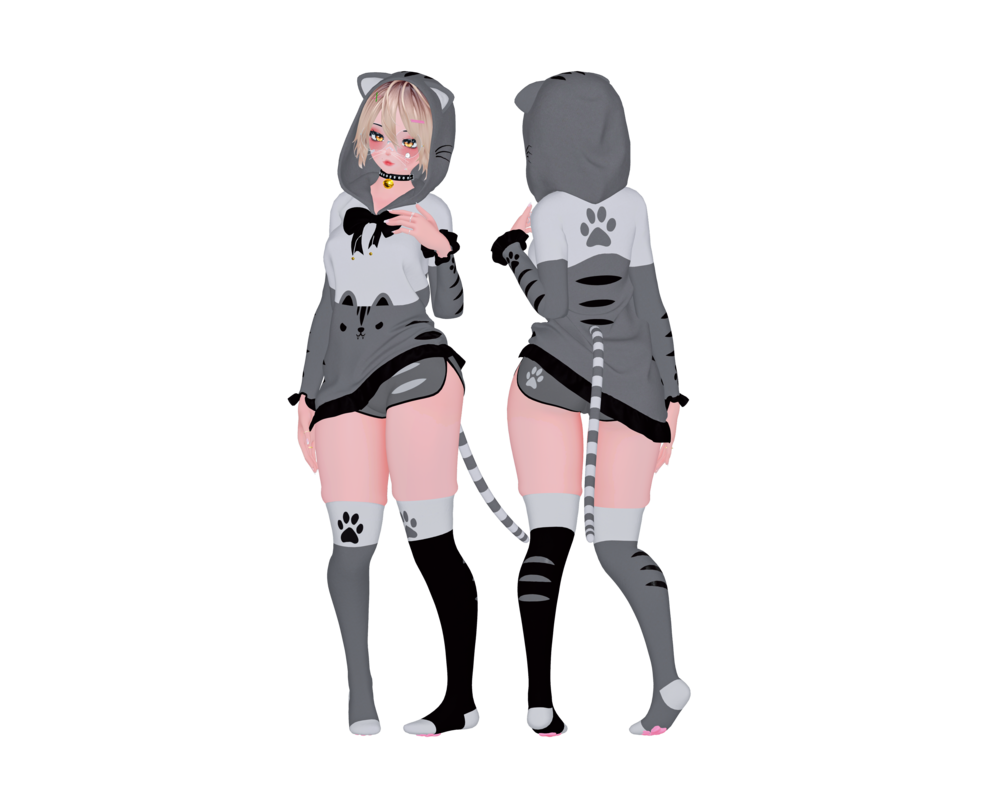 - Cat hoodie, Bra, Short, Panties, Socks, Kitty paw, Kitty necklace, Glasses, Nose bandage, Face (Nose piercing & Eye brow piercing, Body piercing, Earring, Rings, Kitty ears & Kitty tail(Separated Menu), Hoodie bow, Pasties (Ballon and VG pasties), Body Tattoo, Face Makeup, Face freckle, VG hair.