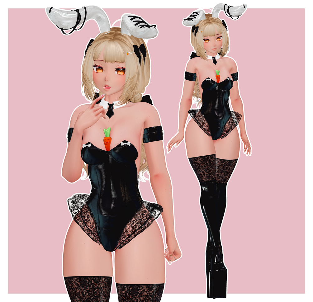 • By me: Bunny set (Ears, Tail), All piercings, Nails (Nail Art),Carrot between ballon, Cuffs chain, Halo & Hallo ribbon, Santa hat,Bunny in cup, Hair pin, Pasties, Poses, All particles, AFK.